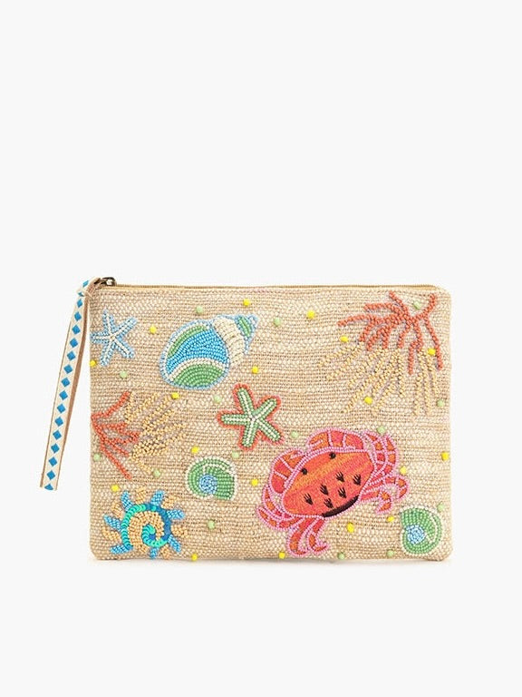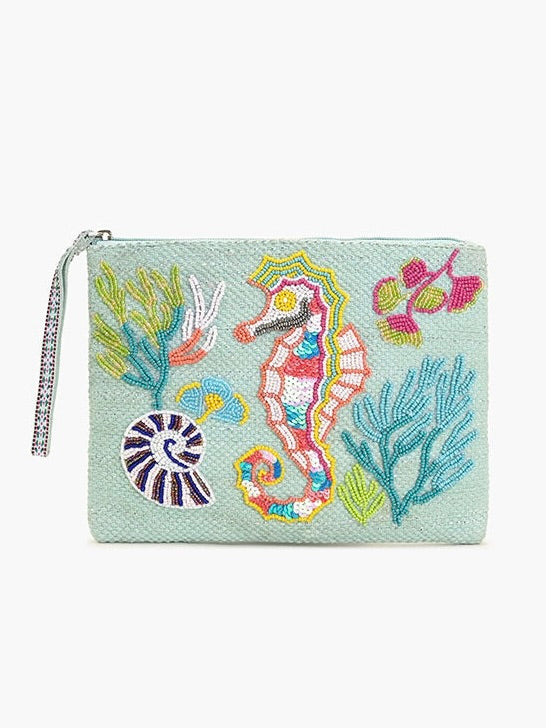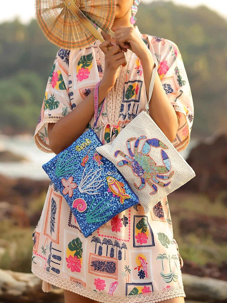 Gorgeous sea life themed beaded bags with wristlet strap and zipper closure. Fully lined with inner zipper pocket. Beading is only on one side.