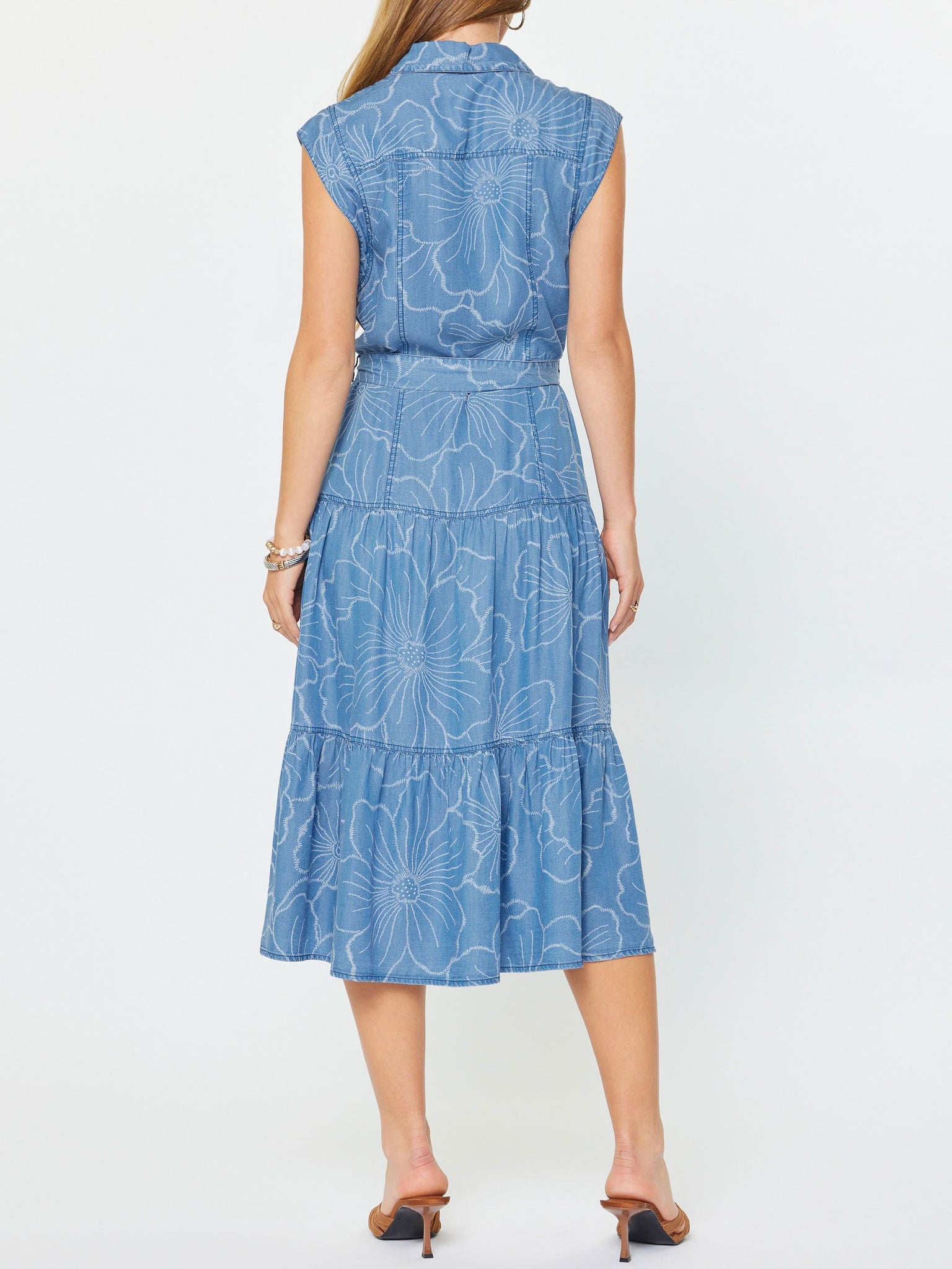 Soft chambray full button down midi dress with collar. Printed floral pattern. Removable self tie belt. Cap sleeves. Drop waist body with tiered skirt.