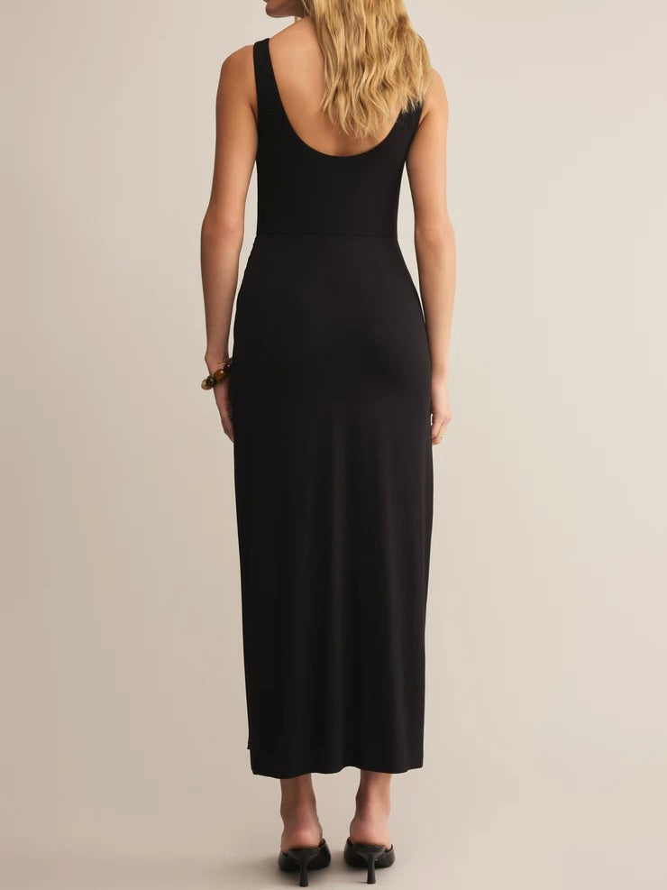 Flattering and fitted, this midi dress features a wide, bra-friendly strap and a flirty mid-thigh slit. Boat neckline and scoop back. Stretch rayon knit.