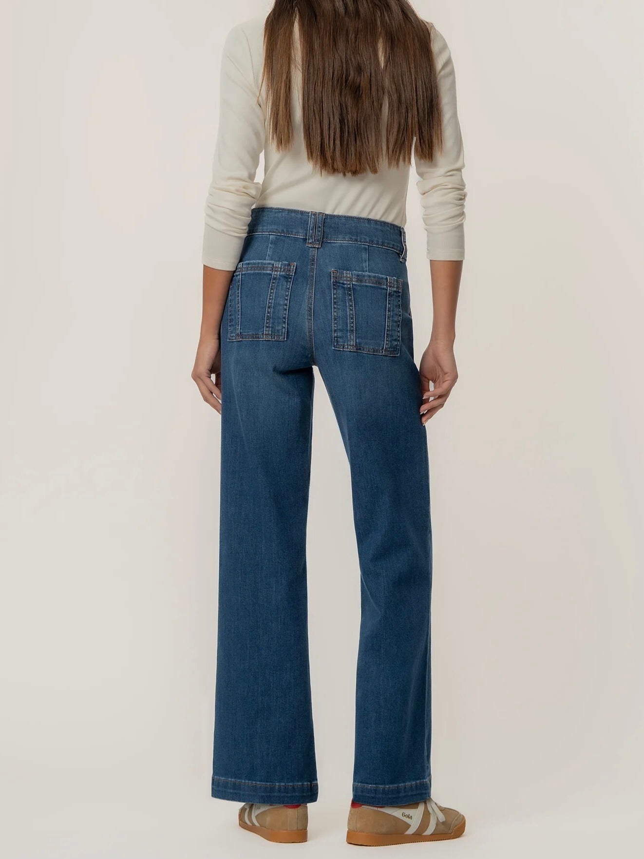 Structured meets effortless in these high rise, straight leg jeans, designed in a classic medium wash with a modern edge. Porkchop pockets and a double button closure add utility-inspired detail, while the stretchy material keeps the fit flexible and flattering from day to night.