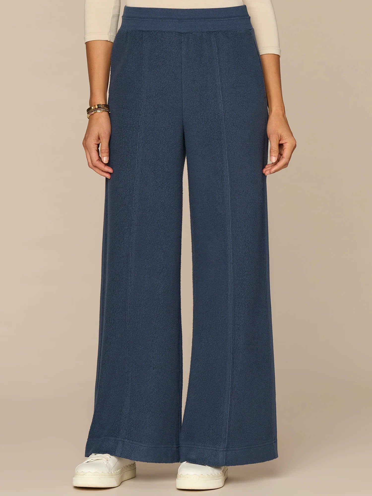 This wide leg knit pant is fitted through the hips with a relaxed, wide opening through the legs. Made with a round up yoke, banded waist, and contrast side panels. Two front pockets. Make it a set with our matching Pull On Panel Knit Pant.