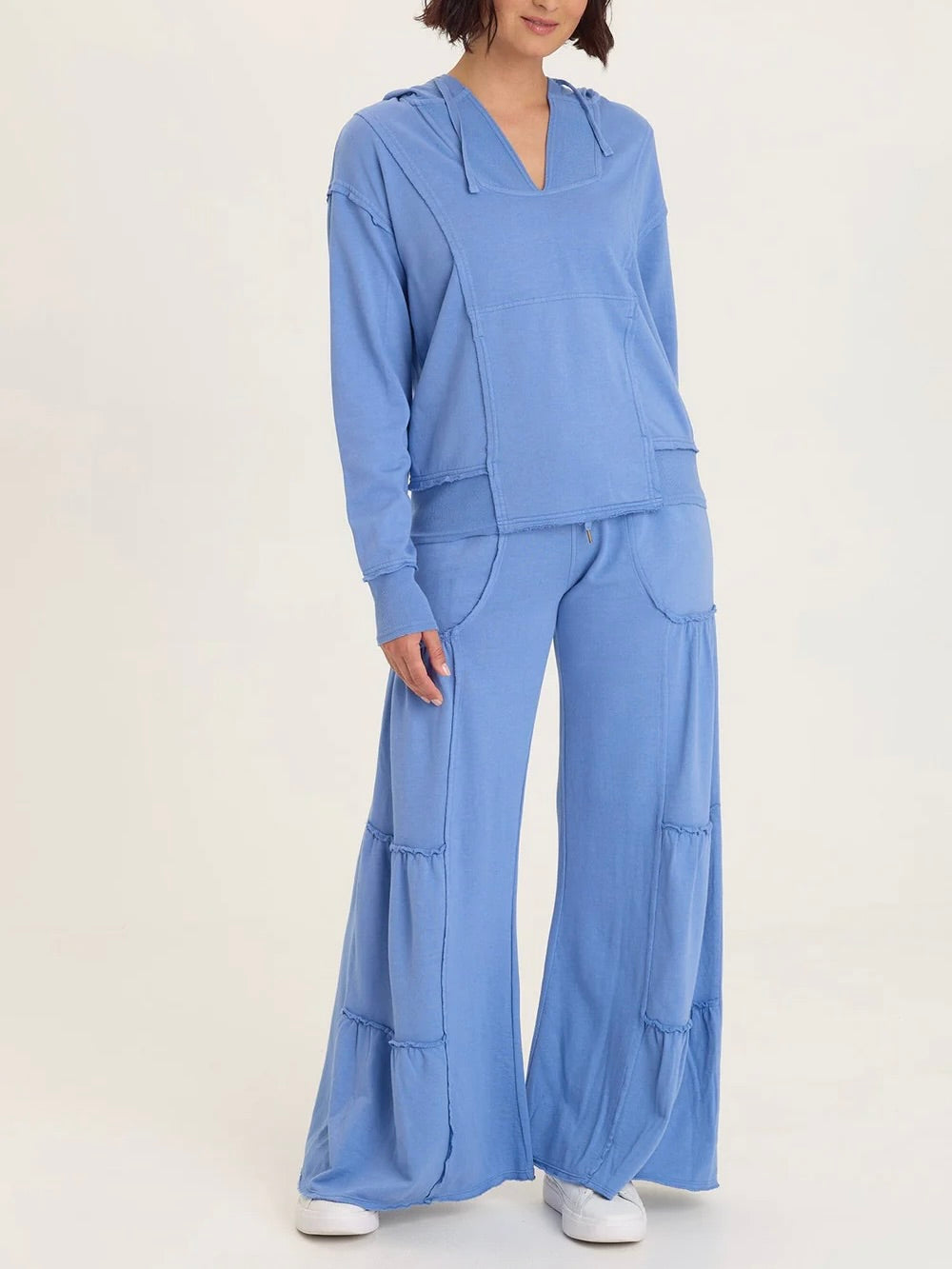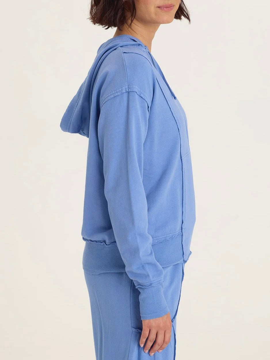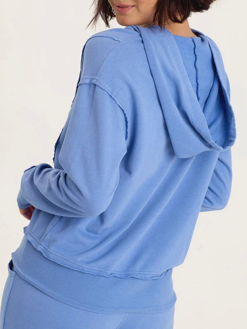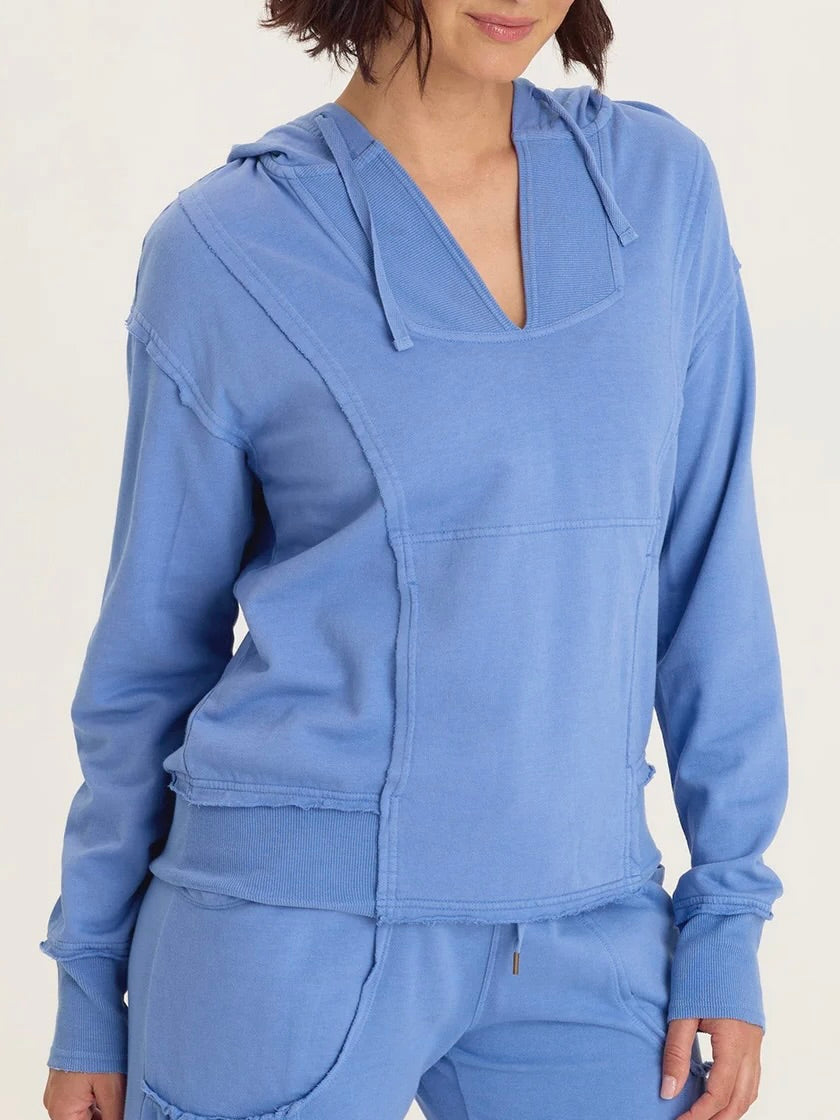 Fleece hoodie with v-neckline and long sleeves. Hood has drawstring. Front kangaroo pocket. Raw seamed details throughout. Rib knit on hemline and sleeve cuffs.