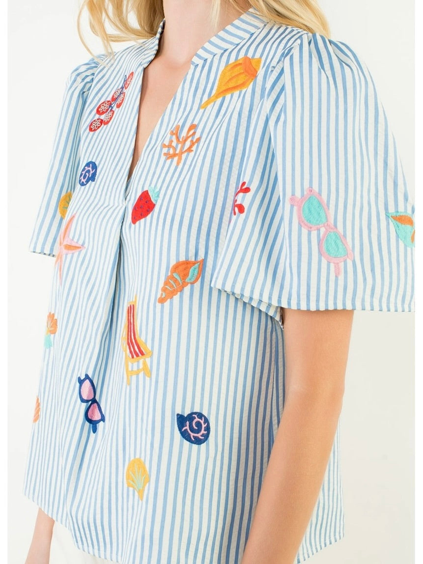 Striped blouse with embroidered beach themed icons. Short sleeves and notched neckline. Fully lined.