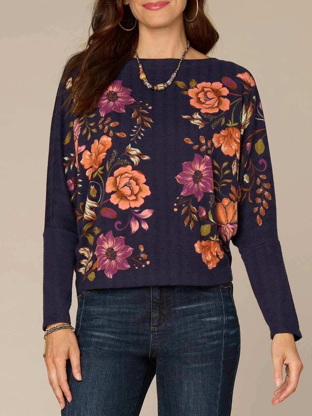 This vibrant knit top adds a pop of color and on-trend style to every look. It has long batwing sleeves, a surplus boat neck, and a pretty placement floral print.