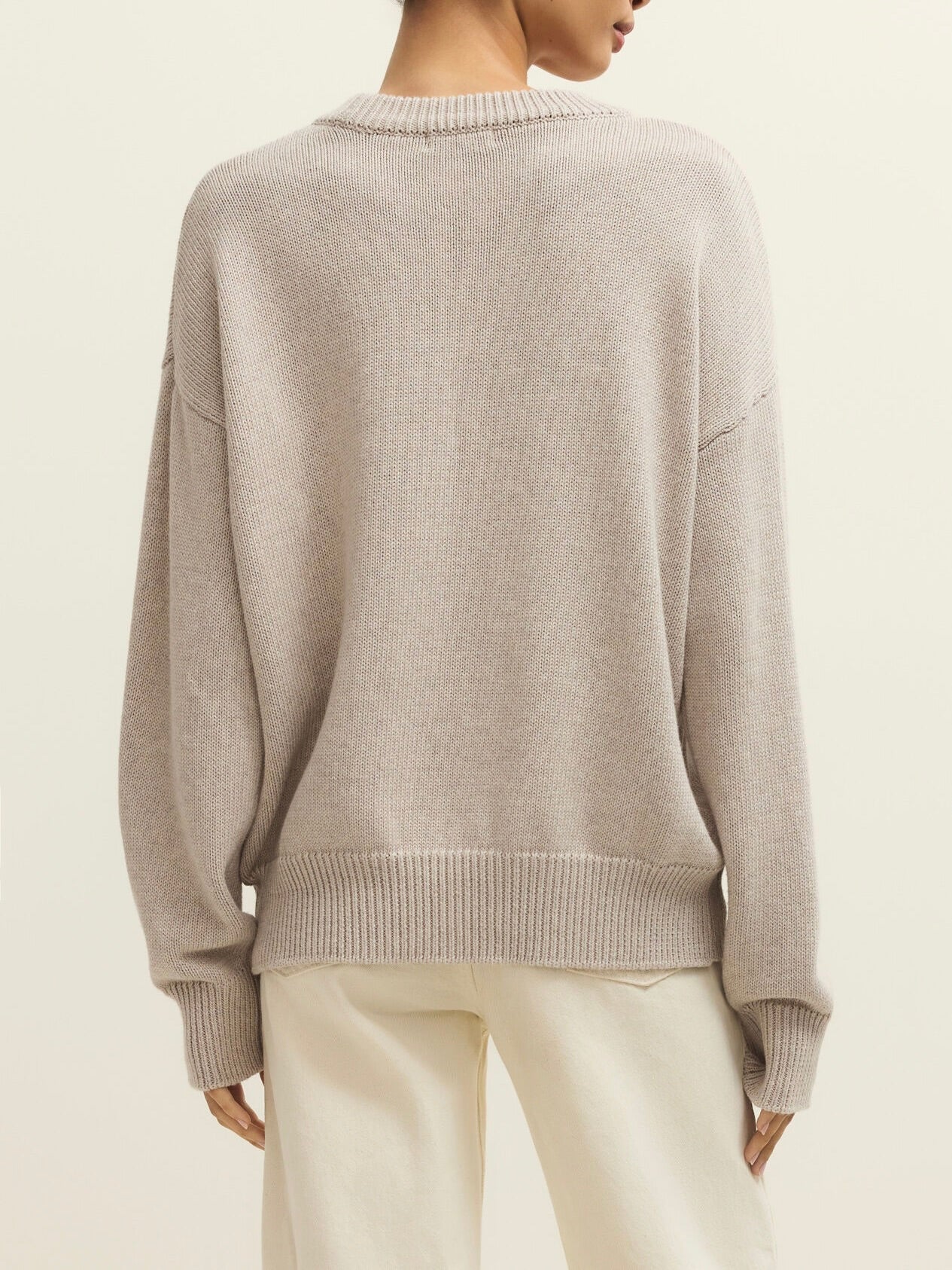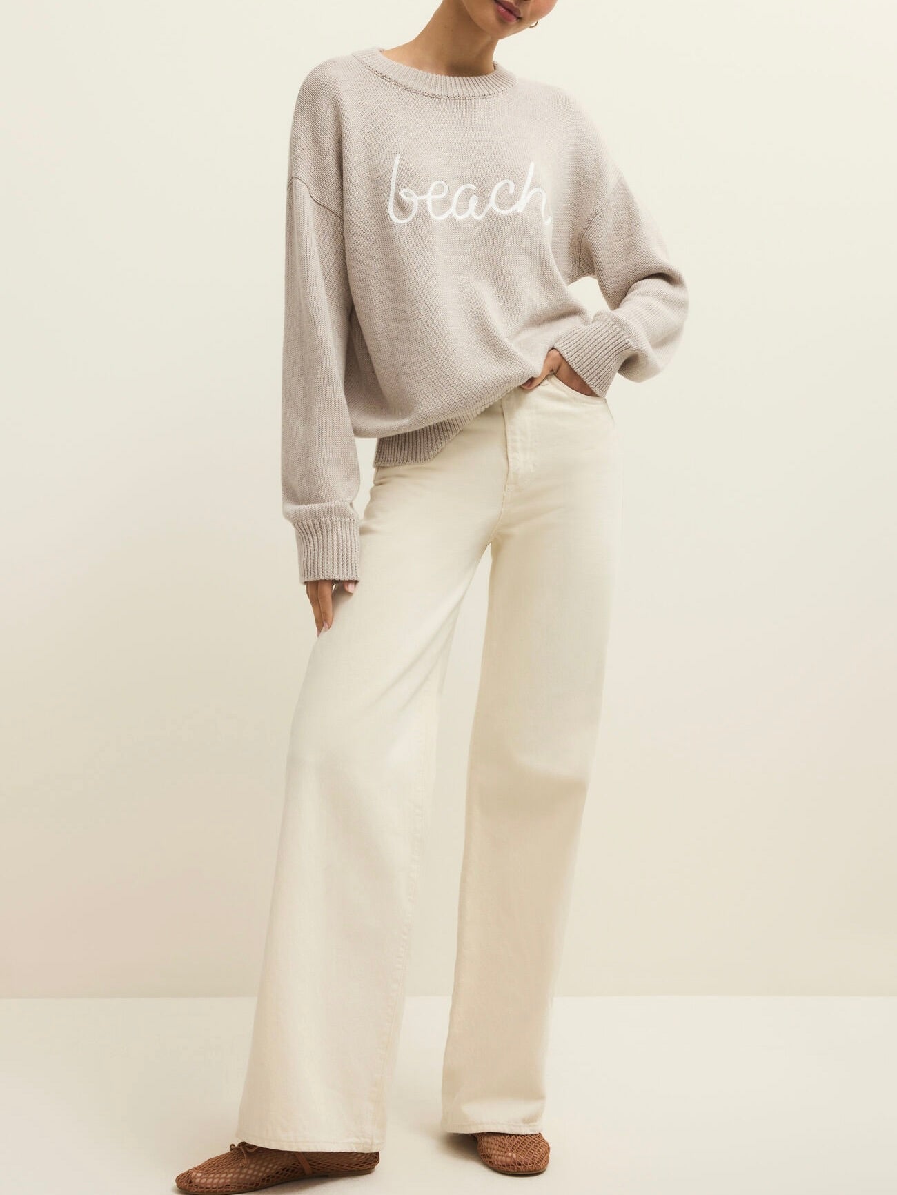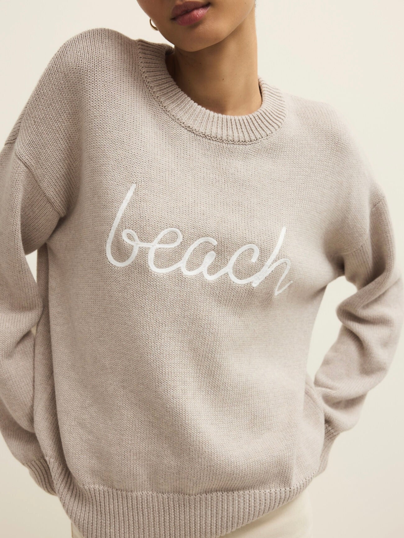 Heavyweight sweater with embroidered cursive "beach" graphic on front. Crew neckline and long sleeves.