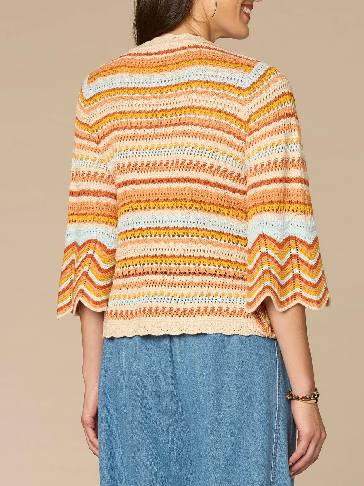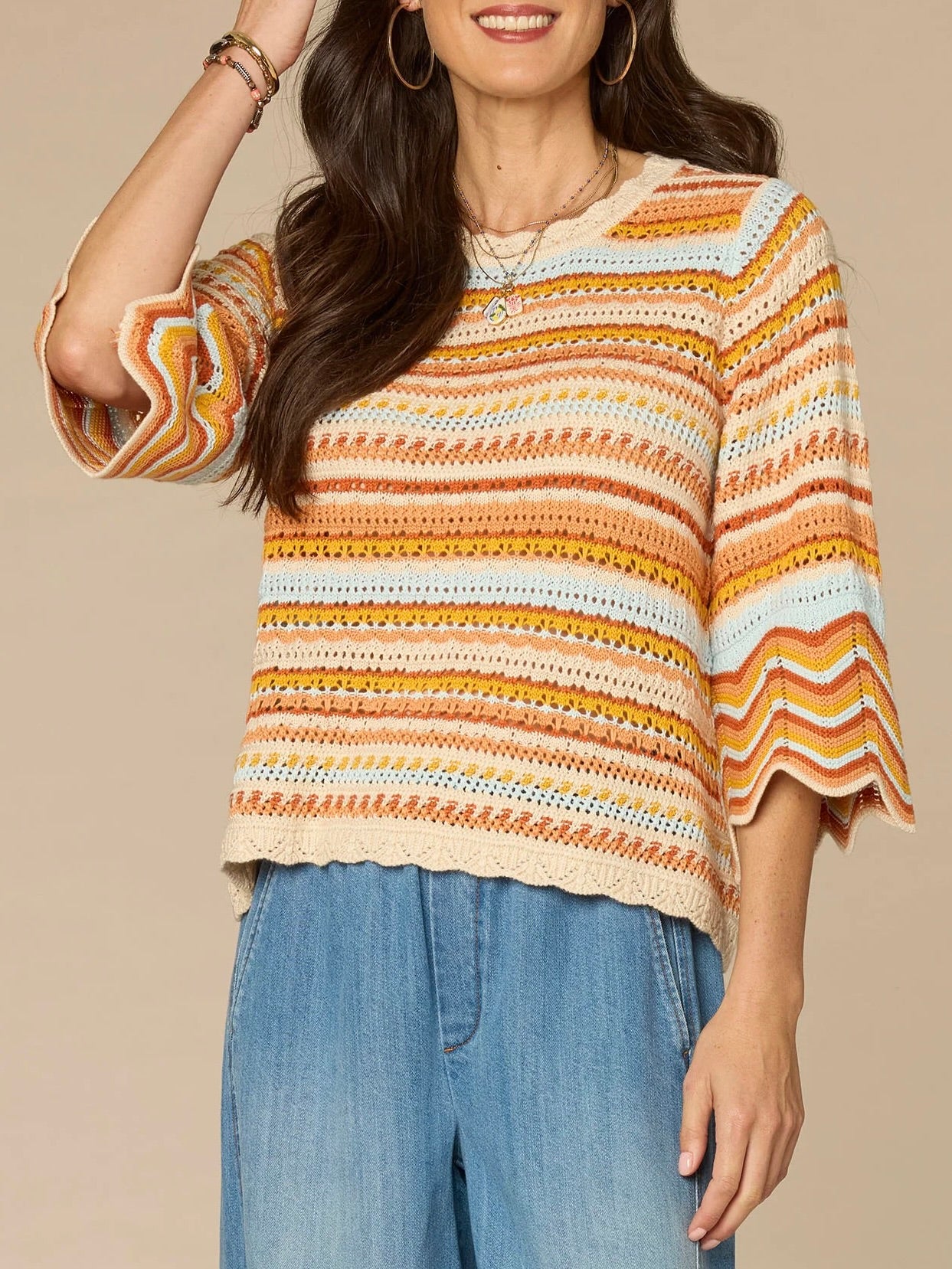 Lean into sweater weather with a twist. This style features three quarter bell sleeves, multi color stripes, crochet stitch detailing, and scallop edges for a bohemian vibe.