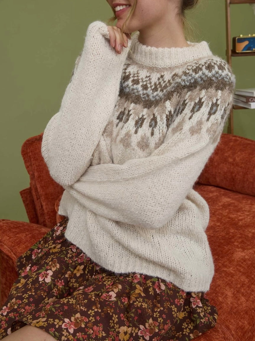 Fuzzy crewneck sweater with fair isle design on shoulders. Long sleeves with rib knit cuffs. Ribbed hemline.