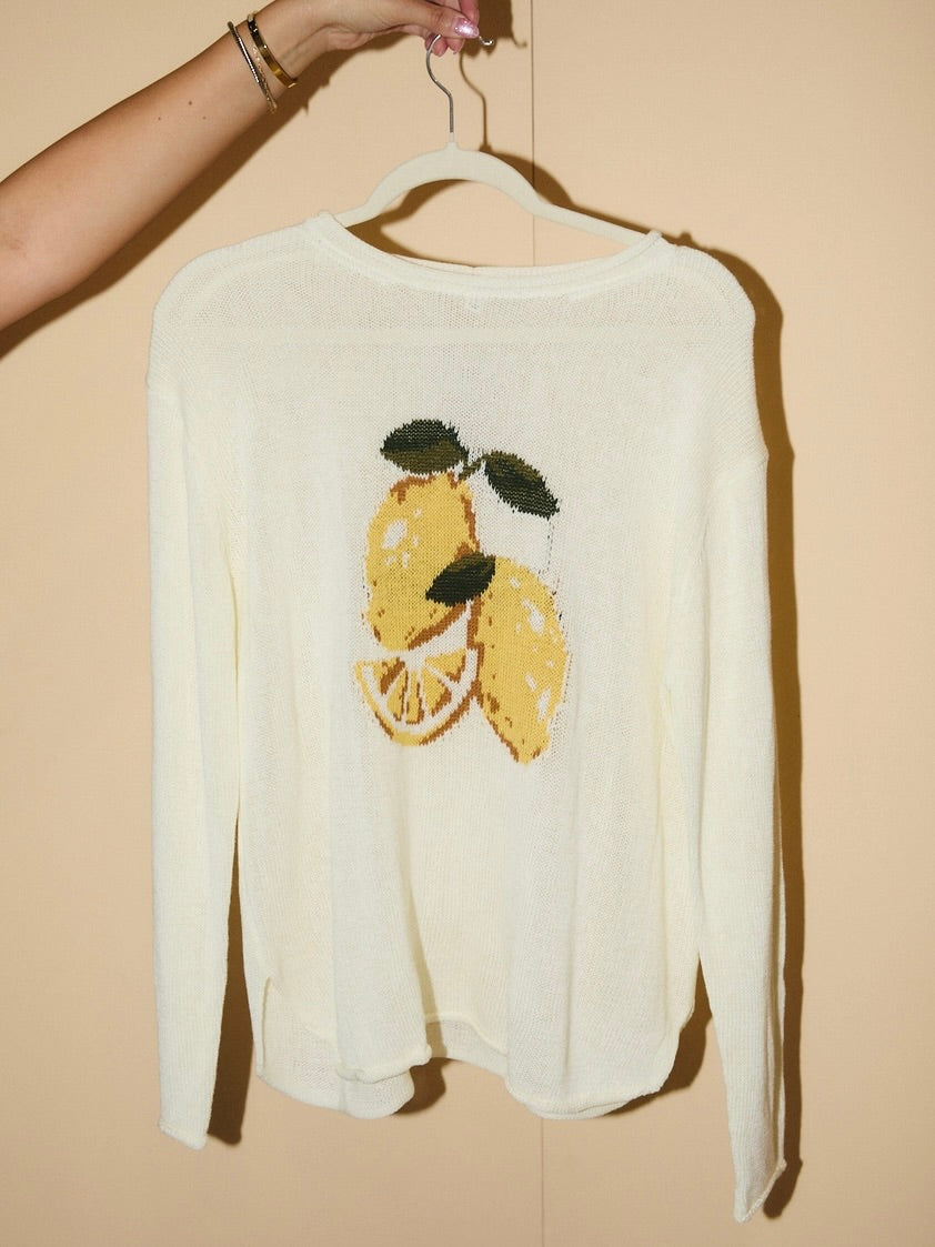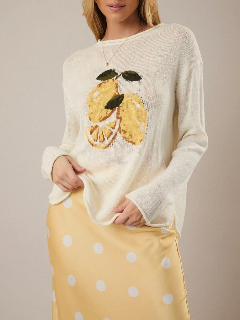 Lightweight sweater with intarsia knit lemons on front. Rolled crew neckline with long sleeves. Curved side slits and slightly longer in the back.
