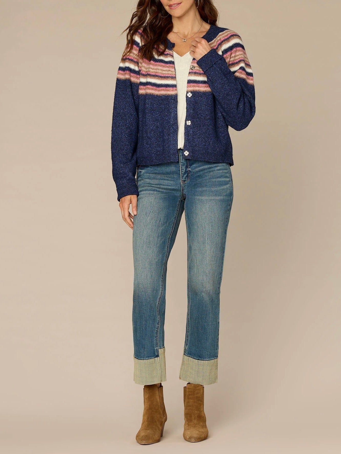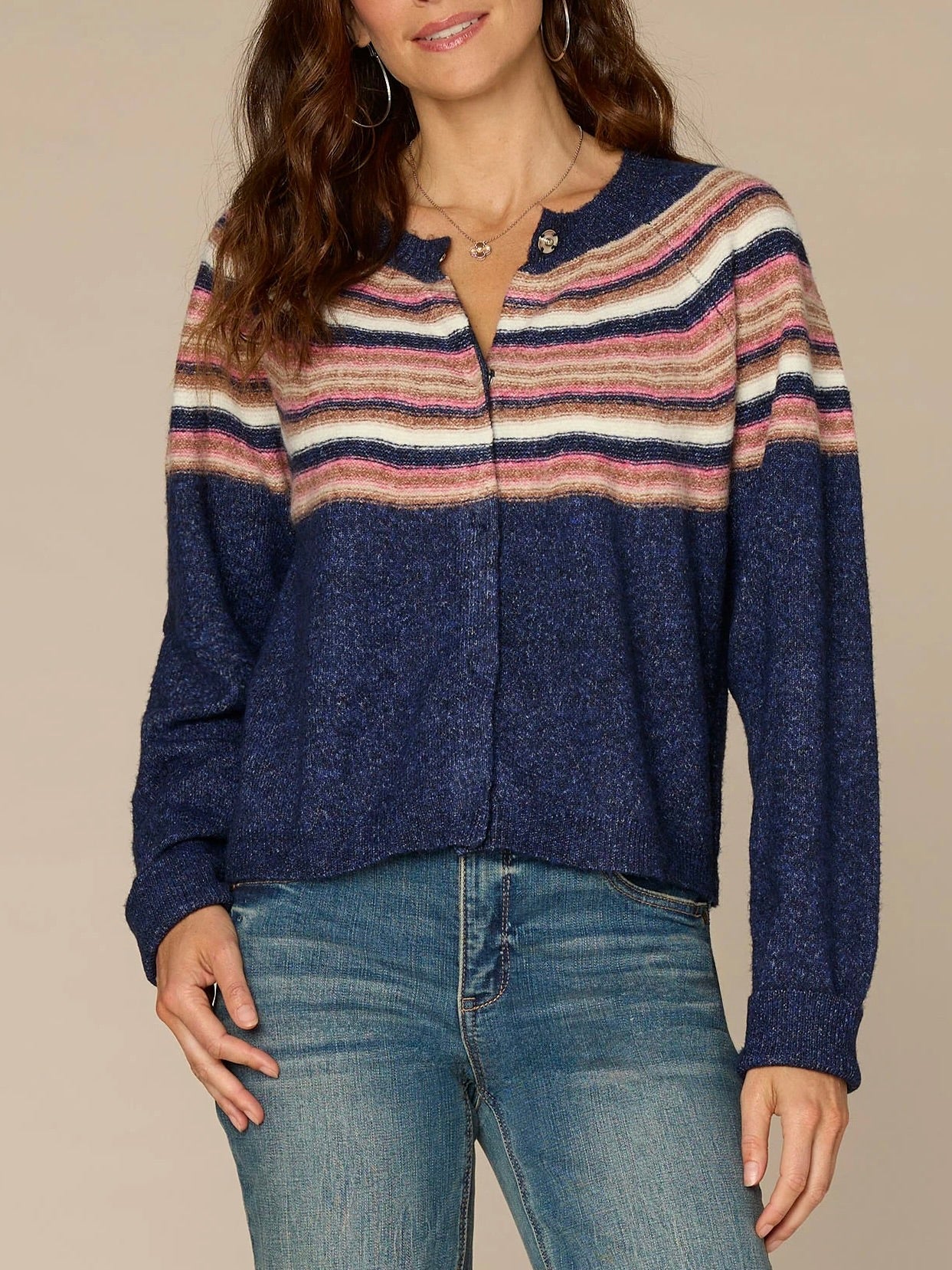 The perfect throw-on-and-go layer. This sweater cardigan features long raglan sleeves, a round neck, hidden snap front, and abstract placement multi color stripes.
