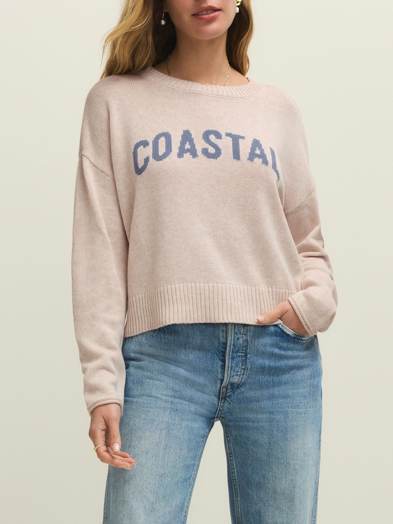 Cropped long sleeve sweater with intarsia "COASTAL" writing on front. Crew neckline with rib knit on sleeve cuffs and hemline.