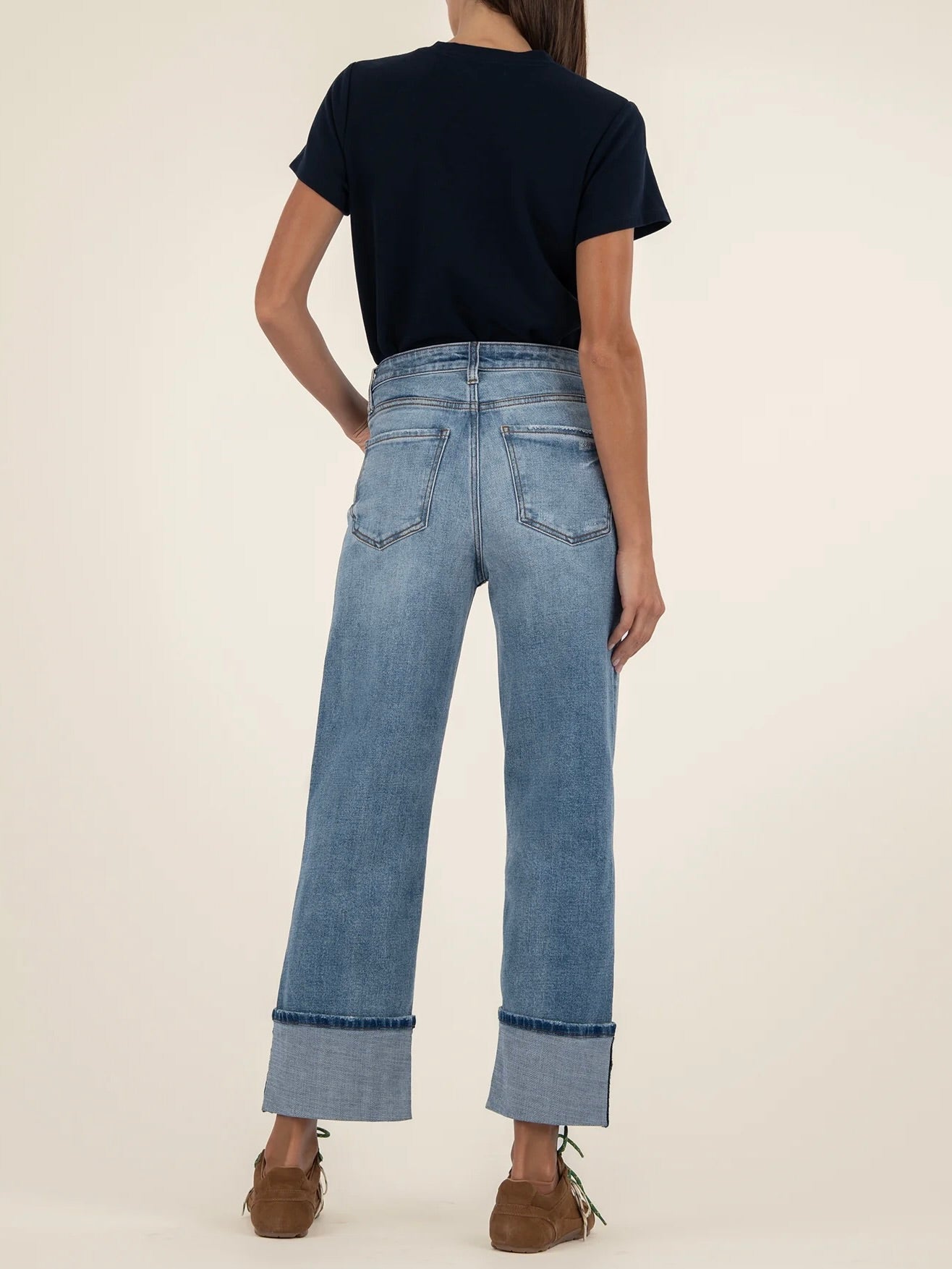 Elevate your everyday with these high-rise straight-leg jeans in a timeless medium wash. The roll-up hem adds a playful edge, while stretchy fabric ensures comfort that keeps up with your day. Cuffs are sewn up.