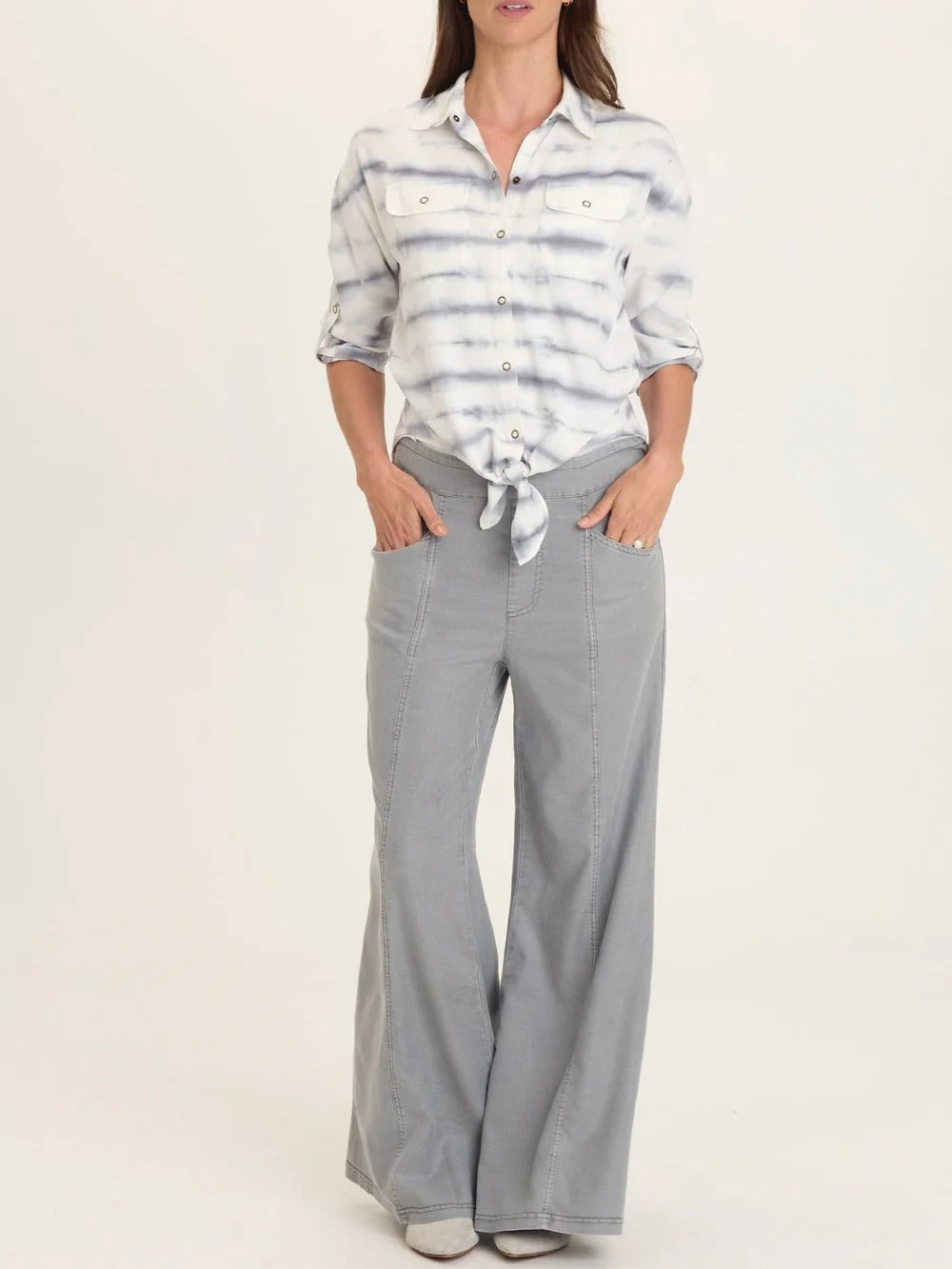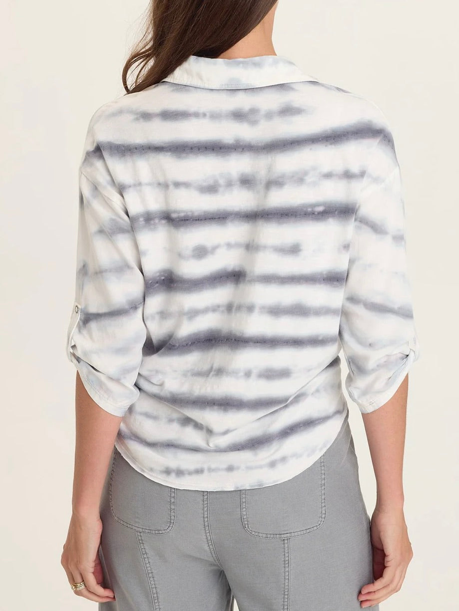 Tabbed sleeves, a classic collar, and flapped breast pockets adorn this snap-up, tie-up top. White and grey tie dye pattern. Mix of woven lyocell and knit. Tie dye patterns vary by top.