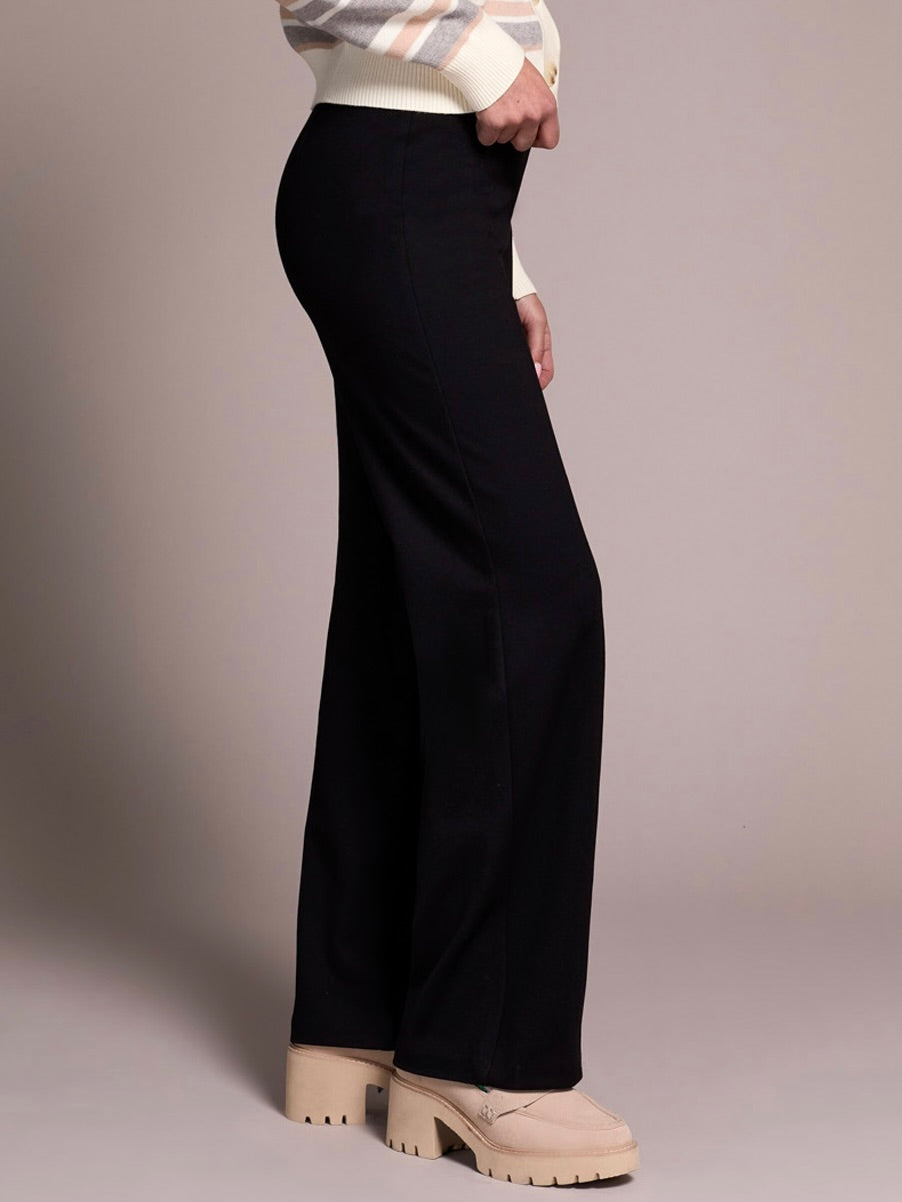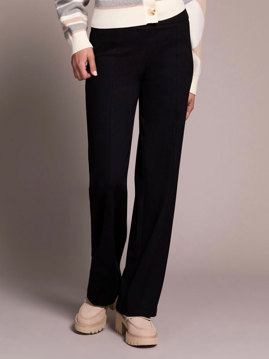 Thick pull on ponte pant with wide waistband. Seaming detail down front of legs. Full length straight leg fit.